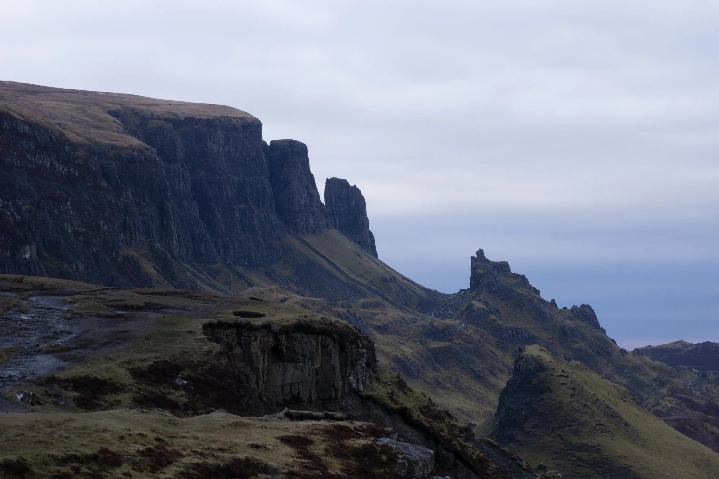 It takes over ninety minutes to drive the length of the Isle of Skye (but likely much longer, because detours are essential). In the south, the coastline around Kylerhea delivers an astute introduction to the scenery to come. Midway up, the Cuillin—named after the Norse word for a conical-shaped mountain—stop people in their tracks, momentarily fooling them into thinking they’re in the heart of the glacier-cloaked Swiss Alps; not Highland Scotland. In the north, my favorite part of the island, the length of a grassy 30-kilometer ridge appears to have been rudely sliced with a serrated knife. This is Tatternish Ridge—Europe’s largest landslip. We stayed for two nights at the northern tip of it, hiking the past the odd, mushroom-topped stacks and droopy overhangs along the base of the landslip as well as the northernmost point, Rubha Hunish, where a bothy perches on a columnar cliff looking over the sea.